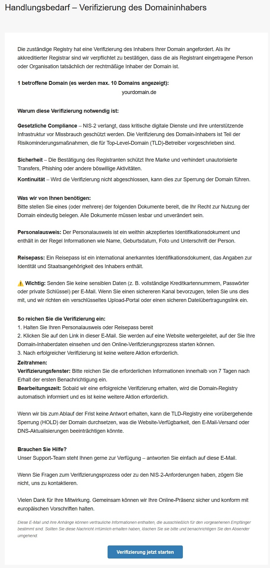 Auch wird es seitens der Denic stichprobenartige "Identitätsprüfungen" geben, bei denen dann mittels Verifizierungsservice (z.B. Perso oder Reisepeis auf IDnow) eine erweiterte Verifizierung durchgeführt werden muss.