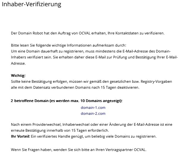 Daher möchte ich mit dieser Info davor sensibilisieren, dass diese Mail nicht einfach gelöscht wird. Nach meinem Kenntnis-Stand enthalten die Mails eine Auflistung der betroffenen Domains.